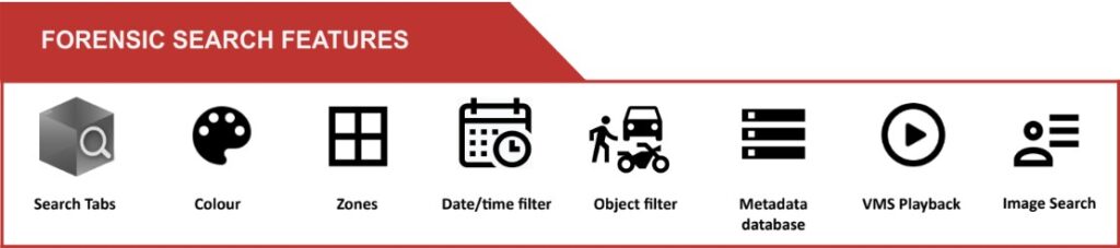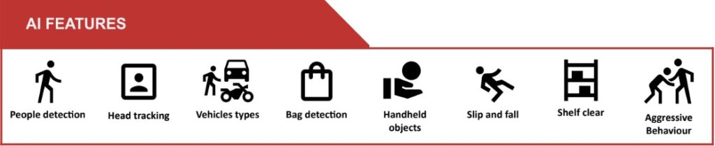The server supports all VCA AI analytics to accurately track people, vehicles, other objects, and specific events such as slip-and-fall, handheld objects, shelf clearance, and left bags.